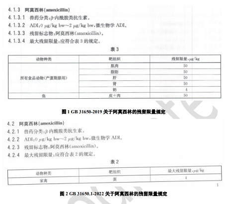 在查詢上述食品安全國(guó)家標(biāo)準(zhǔn)中規(guī)定的獸藥殘留限量要求時(shí),需要關(guān)注兩個(gè)標(biāo)準(zhǔn)中適用的殘留標(biāo)志物、動(dòng)物種類、靶組織、最大殘留限量等信息。例如,GB 31650-2019中規(guī)定了阿莫西林在所有食品動(dòng)物肌肉、脂肪等靶組織中的殘留限量值為50μg/kg(如圖1),GB 31650.1-2022規(guī)定了阿莫西林在家禽蛋中的最大殘留限量為4μg/kg(如圖2);如果我們需要查找雞肉中阿莫西林的殘留限量,應(yīng)該查詢GB 31650-2019,其限量值為50μg/kg,如果我們需要查找雞蛋中阿莫西林的殘留限量,應(yīng)該查詢GB 31650.1-2022,其限量值為4μg/kg。